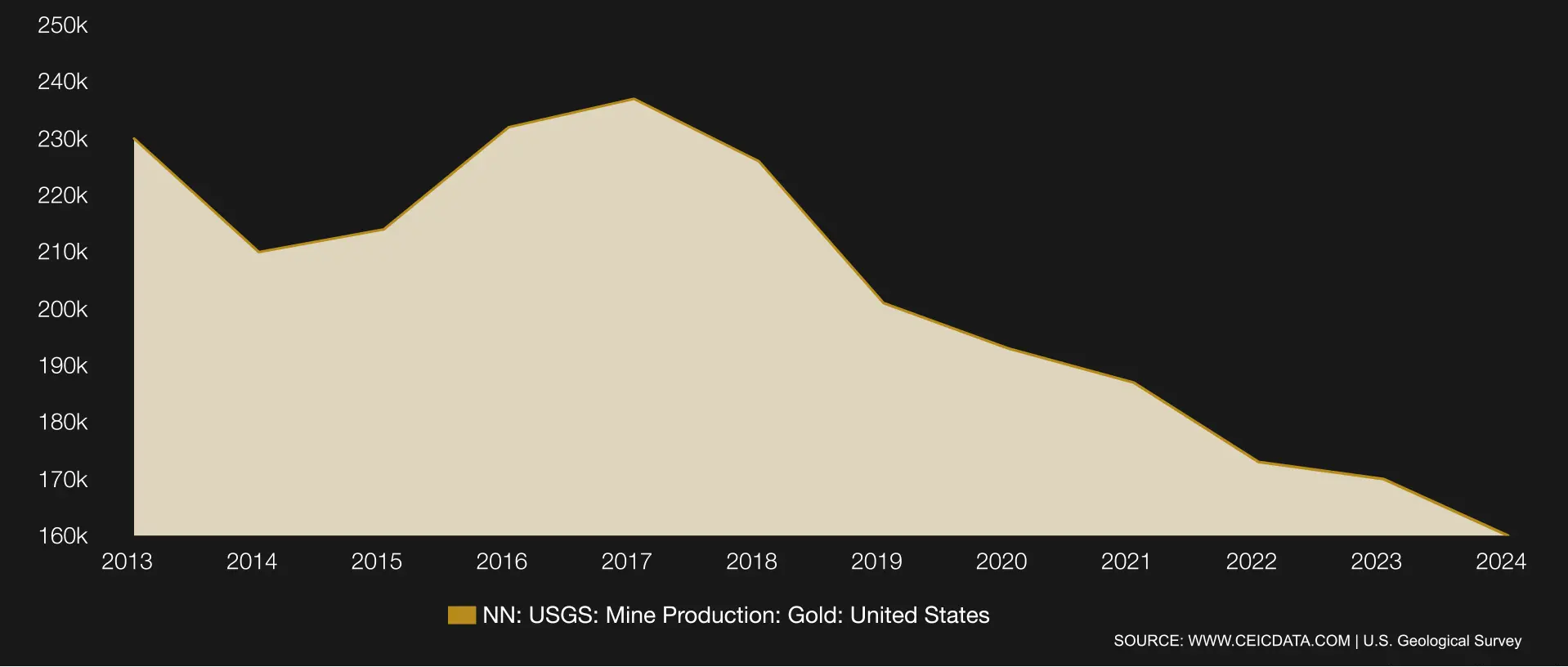 Gold supply is constrained by declining mining yields, geopolitical risks in key producing regions, and challenges in maintaining sustainable production levels.